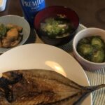 | 夜 | ほっけの開き・ごぼうレンコン厚揚げの甘辛和え・みそ汁・もずくときゅうりの酢の物・ビール |